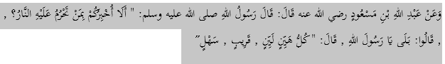 Dari Abdullah bin Mas’ud RA Rasulullah Shalallahu alaihi wa salam , bersabda : "Maukah kalian aku tunjukkan orang yang Haram baginya tersentuh api neraka?" Para sahabat berkata: "Mau, wahai Rasulullah! Beliau menjawab : "Mereka adalah orang yang Hayyin, Layyin, Qarib, Sahl." (H.R. At-Tirmidzi 2488 dan Ibnu Hiban 470).